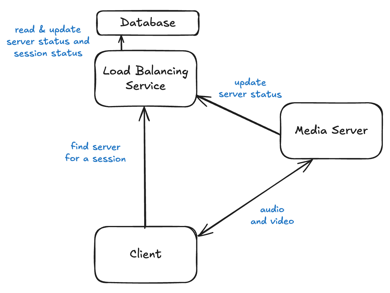 - Load balancing service: The client application’s initial point of contact, selecting the appropriate media server for a session.